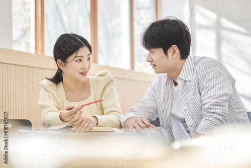asia, korea, higher education, campus, worry, pain, awakening, comforting, encouraging, 2, young, college students, teacher, intelligence, man, stripes, book, study, assignment, classroom, university, desk, chair, ball pen, sitting, eye contact, indoor, prof, student, backview, audience, seriousness, pleasant, funny, online, sleepy, looking up