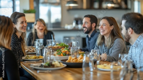 Colleagues enjoying a team lunch, engaging in casual conversation that fosters relationships and a positive work environment.