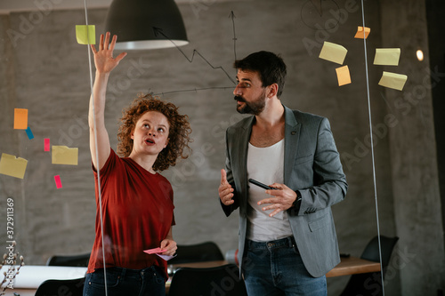 Colleagues in office. Businesswoman and businessman discussing work in office..