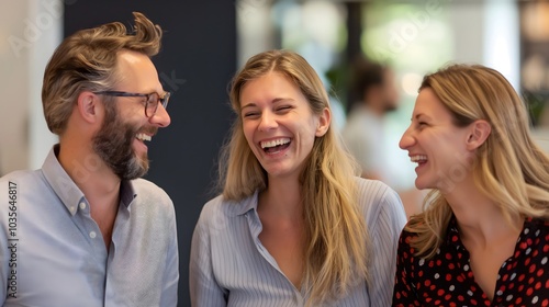 colleague, co-worker, laugh, smile, office, workplace, camaraderie, teamwork, collaboration, friendship, man, woman, beard, goggles, blond, long hair, white shirt, casual attire, professional, business, corporate, joy, happiness, interaction, communication, group, trio, body language, facial expression, eye contact, natural light, indoor, bright, open space