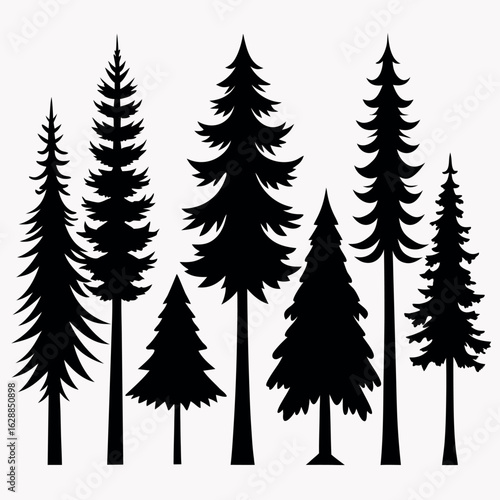 pine, tree, conifer, evergreen, forest, nature, timberland, silhouette, icon, symbol, graphic, design, illustration, vector, isolated, white, background, black, winter, seasonal, plant, botanical, landscape, set, collection