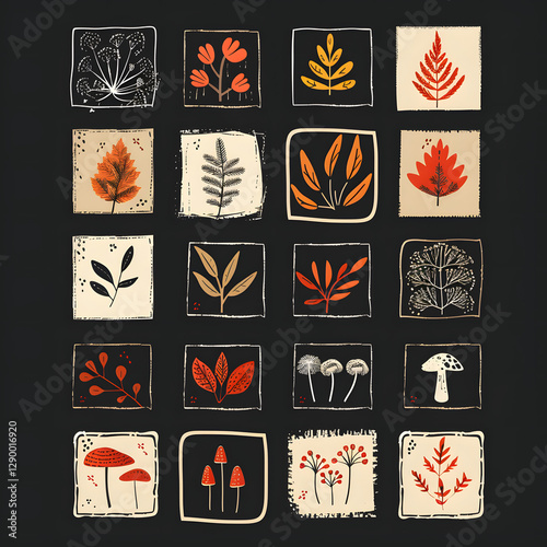 botanical, abstract, illustration, plant, leaf, mushroom, nature, dark, background, autumn, seasonal, floral, earthy, foliage, artistic, design, creative, decorative, minimalistic, modern, organic, element, vintage, retro, textured, black, beige, orange, red, pattern, square, forest, whimsical, delicate, sophisticated, stylish, aesthetic, contemporary, graphic, hand-made, rustic, timberland, conceptual, creation, periodical, project, idea, new