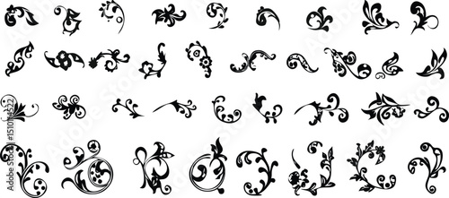 floral, swirl, flourishes, design element, black-and-white, vector, graphic, ornament, decoration, pattern, vintage, retro, elegant, classic, art, illustration, clip art, background, texture, template, border, frame, scroll, leaf, flower, decorative, stylish, whimsical