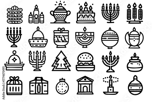 collection, icon, holiday, candle, decoration, christmas, religion, hot, variety, cake, set, symbol, gift, celebration, outline, judaism, line, menorah, jewish, star, black, design, signs, david, thin, flat, party, white, present, religious, winter, linear, tradition, calendar, christmas, israel, gelt, pictogram, torah, donut, bell, coin, oil, snowman, culture, light, book