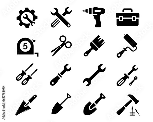 tool, icon, wrench, spanner, screwdriver, drill, toolbox, tool kit, measuring tape, scissors, paintbrush, trowel, shovel, hammer, gear, construction, repair, bricolage, illustration, graphic design, symbol, set, collection, hardware, building, craft, maintenance, workshop