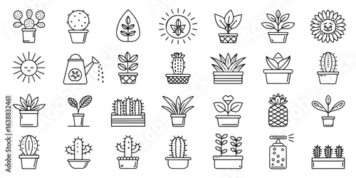 houseplant, potted plants, cactus, succulent, gardening, line art, vector graphics, illustration, black-and-white, minimalist, garden tool, watering can, sun, flower, botanical, design element, logo design, pattern, home decor, nature, icon, icon, vector, set, symbol, food, signs, silhouette, holiday, design, tree, logotype, hot drink, decoration, cake, drink, star, cup