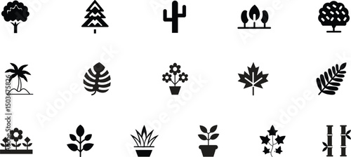 Collection of black and white plant and tree icons