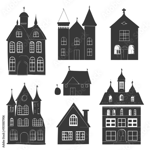 building, house, church, silhouette, black, white, roof, window, door, church steeple, cross, gable, facades, structure, architecture, urban, town, city, vintage, gothic, traditional, style, design, illustration, graphic, art, simple, abstract, geometric, shape, outline, vignetting, doodle, hand-drawn, line, flat, minimalist, icon, symbol, element, set, collection