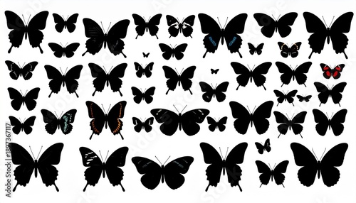 Collection of Black Butterfly Silhouettes on White Background