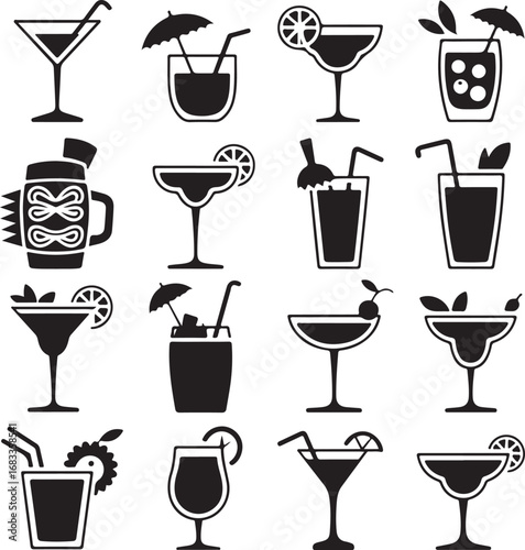 cocktail, drink, beverage, glasses, icon, silhouette, collection, set, tropical, umbrella, straw, lime, mint, margarita, martini, tiki, juice, refreshment, celebration, party, summer, alcohol, bar, eatery, cafes, menu, design, graphic, simple, flat