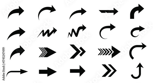 arrow, direction, symbol, pointer, navigation, graphic, design, icon, black, white, collection, set, various, shape, curve, straight, zigzag, chevron, pointing, right, up, forward, movement, indicator, next, previous, go, choose, select, click, transport, signal, communication, web, interface, graphic design, vector, illustration, arrow, signs, buttons, icon, play, element, down