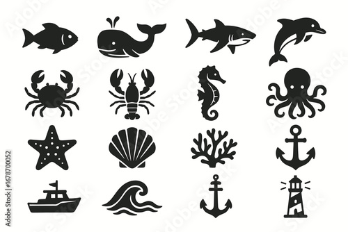collection, icon, sea, life, whale, shark, dolphin, fish, crab, lobster, seahorse, octopus, star, shell, coral, anchor, boat, wave, lighthouse, marin, aquatic, ocean, nautical, symbol, silhouette, graphic, design, element, vector, icon