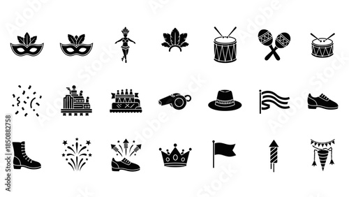 mask, drum, confetti, cake, whistle, hat, flag, shoe, boot, fireworks, crown, garland, celebration, party, carnival, festival, event, festive, fun, joy, happy, music, instrument, rythm, sound, percussion, dessert, sweet, food, symbol, national, object, item, collection, set, icon, silhouette, graphic, vector, design, element, black, isolated, illustration, art, pictogram, signs, shape