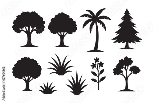 tree, plant, silhouette, black, white background, nature, foliage, leaf, branch, flora, vegetation, forest, park, garden, organic, growth, design element, graphic, illustration, collection, set, isolated, deciduous, evergreen, pine tree, palm tree, bush, grass, flower