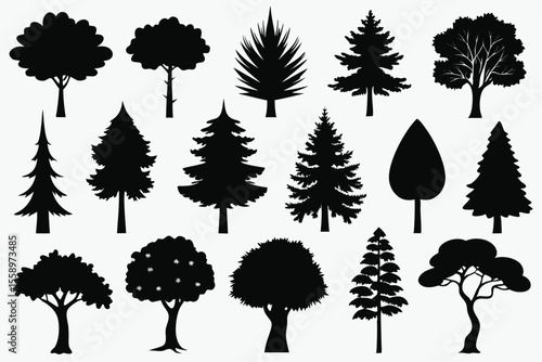 tree, tree, silhouette, silhouette, black, black-and-white, graphic, graphic, design, element, nature, forest, wood, timberland, conifer, evergreen, deciduous, oak, pine, fir, cedar, plant, plant, flora, botanical, illustration, icon, symbol, vector, clip art, isolated, white background, simple, minimalist, set, collection