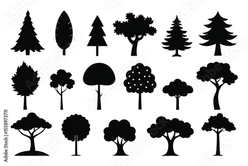 tree, tree, silhouette, black, white, background, nature, forest, wood, icon, symbol, design, element, graphic, illustration, vector, clip art, deciduous, coniferous, evergreen, oak, maple, pine, fir, birch, leaf, branch, botany, ecology, environment, landscape, park, garden, timberland, silhouette, simple, minimalist, flat, isolated, set, collection, different, type, variety