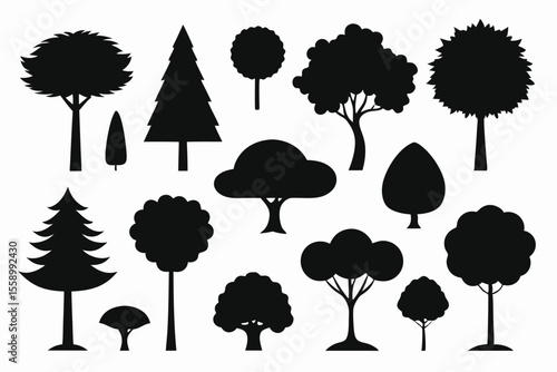 tree, tree, silhouette, black, white, background, nature, forest, wood, graphic, design, element, illustration, icon, symbol, set, collection, various, type, shape, foliage, branch, leaf, evergreen, deciduous, oak, pine, fir, bush, shrub, plant, flora, vector, clip art, isolated, simple, minimalist