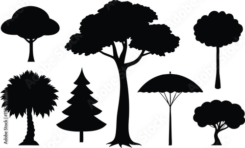 tree, tree, silhouette, black, black-and-white, graphic, design, element, nature, plant, plant, forest, wood, wood, palm, fir, umbrella, parasol, shade, summer, tropical, evergreen, deciduous, illustration, vector, clip art, isolated, background, white, simple, minimalist, symbol, icon, set, collection, group