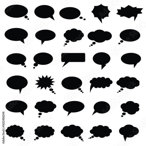 speech bubble, thought bubble, conversation, communication, message, text, graphic, illustration, vector, icon, set, collection, shape, black, white background, empty, blank, design element, comic, cartoon, talk, thinking, idea, comment, quote