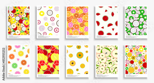 Collection of bright color summer fruits posters, templates, backgrounds placards, brochures, banners, flyers and etc. Juicy drawing covers. Vibrant nature cards
