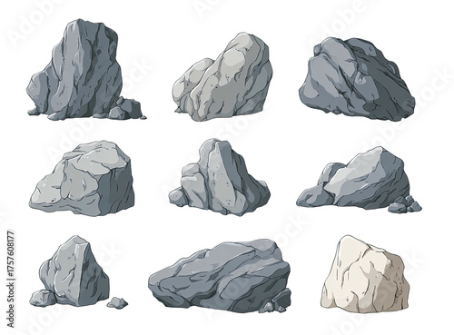 rock, collection, cartoon, shape, size, grey, white, illustration, textured, various, set, design, graphic, element, digital, artistic, different, natural, stone, earth, rugged, uneven, detailed, form, style, variation, realistic, simple, modern, vector, isolated, flat, background, decorative, rock, boulder, pile, cliff, mountain