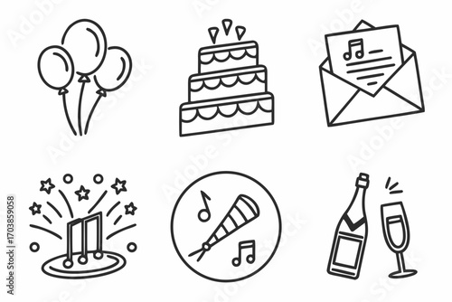 party, celebration, birthday, music, icon, set, collection, balloon, cake, champaign, envelope, invitation, music notes, fireworks, microphone, toast, drink, illustration, graphic design, vector, simple, outline, line art, festive, event, anniversary, concert, performance, icon, symbol, food, signs, design, black, pizza, silhouette, travel