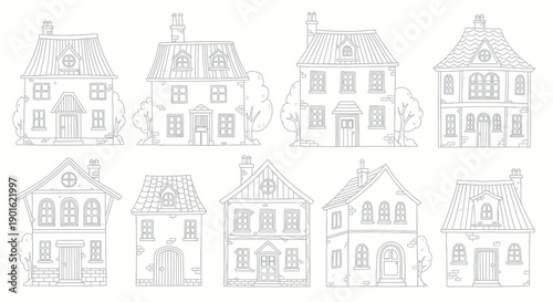 Collection of charming hand-drawn vintage houses with intricate details.