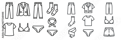 clothing, collection, line, art, accessory, icon, apparel, fashion, icon, set, trousers, pant, jacket, blazer, t-shirt, tee, sock, underclothing, bra, panty, foulard, bandana, short, outline, graphic, design, style, clothes rack, garment, accessory