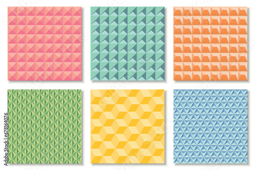 Collection of color seamless geometric patterns. Repeatable bright fashion backgrounds. Decorative endless 3d tile textures