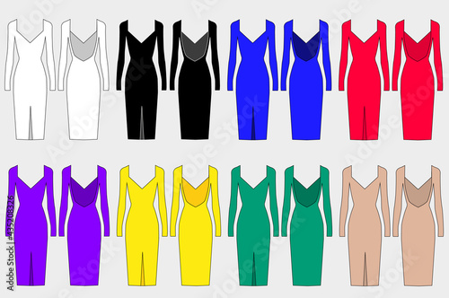 Collection of colored dresses. Dress patterns for sewing. Front and back views. Evening outfit. Casual, business dress. Vector illustration