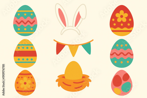 easter, egg, decorated, colourful, rabbit, ear, chick, collection, set, icon, festive, spring, holiday, celebration, pattern, stripes, polka, dot, zigzag, yellow, red, green, blue, orange, cute, cheerful, playful, design, graphic, illustration, clip art, symbol, traditional, seasonal, fun, bright, vibrant, simple, cartoon, style, banner, flag, white, background, happy, joyful, decorative, easter egg, easter bunny