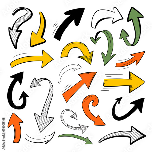arrow, arrow, hand-drawn, doodle, direction, pointing, navigation, infographic, icon, design, symbol, vector, graphic, illustration, drawing, vignetting, curve, straight, colourful, black, white, orange, yellow, green, art, movement, choice, pointer, decorative, element