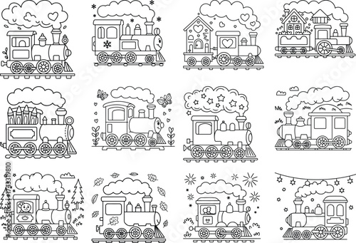 Collection of Cute Cartoon Trains for Coloring Pages vector illustration