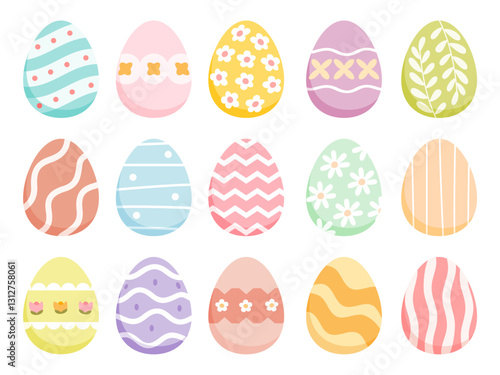 Collection of cute Easter eggs with pastel colours paint. Floral, geometric, and seasonal pattern decorative