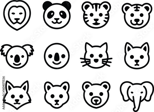 animal, icon, cute, drawing, hand-drawn, illustration, vector, face, head, set, collection, simple, outline, black-and-white, cartoon, wildlife, zoo, pet, lion, panda, tiger, koala, cat, dog, bear, elephant, mammal, graphic, design, art, symbol, sticker, clip art, baby, children, education, pattern, template, white background, isolated