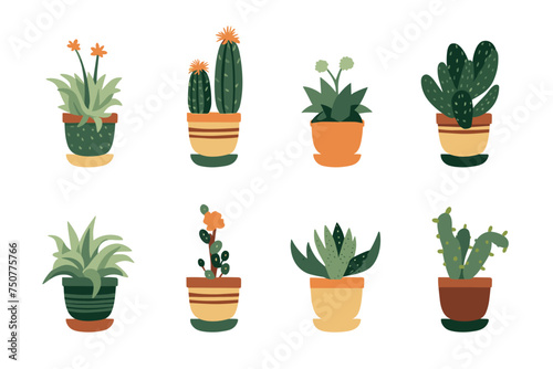 Collection of decorative houseplants and succulents isolated on white background. Trendy plants growing in pots or planters. Flat colorful vector illustration.