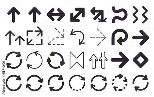 arrow, arrow, icon, icon, symbol, symbol, direction, navigation, pointer, design, graphic, illustration, vector, set, collection, up, down, left, right, diagonal, curved, circular, refresh, reload, rotate, repeat, cycle, forward, backward, next, previous, back, expand, contract, move, drag, swipe, zigzag, wave, line, outline, solid, black, white background, silhouette, interface