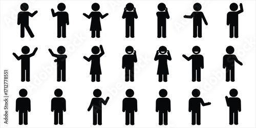 silhouette, people, figure, icon, man, woman, children, standing, walking, waving, talking, listening, thinking, simple, black-and-white, graphic, vector, collection, set, group, diverse, pose, action, communication, emotion, body language, gesture, representation, human, character, isolated, white background, pictogram, symbol, illustration, design element
