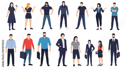 people, individual, man, woman, adult, character, figure, illustration, vector, drawing, cartoon, graphic, art, style, creative, concept, business, professional, casual attire, attire, clothing, style, pose, standing, gesture, diversity, variety, representation, collection, group, set, white background, isolated, modern, simple, clean, design, template, web, digital, presentation, team