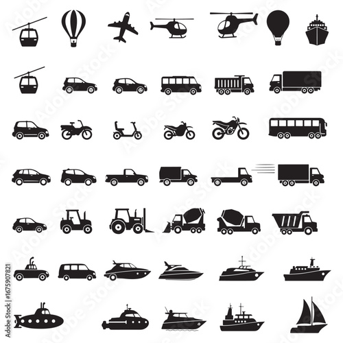 transportation, vehicle, silhouette, car, aeroplane, boat, vector, logistic, travel, engineering, icon, infographic, website, print, style, design, automotive, shipping, aerial, marin, public transport, motorbike, helicopter, hot air balloon, cement mixer, tractor, forklift, bus, trailer, van, vessel, yacht, sailboat, passenger ship
