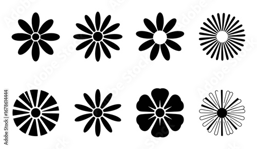 flower, daisy, icon, symbol, graphic, design, nature, floral, bloom, black-and-white, simple, minimalist, vector, illustration, set, collection, pattern, decorative, organic, botanical, spring, summer, beauty, elegance, clean, modern, abstract, isolated, white background, graphic design, art, creative, stylised, flora, shape