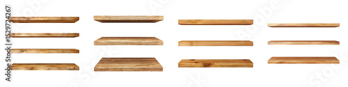 Collection of empty wooden shelves, isolated on a transparent background