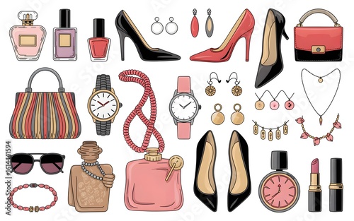 fashion accessories, shoe, handbag, nail polish, watches, necklace, earring, sunglasses, lipstick, bracelet, fashion, style, glamour, beauty, luxury, feminine, elegant, chic, accessory, collection, outfit, shopping, vector, shoe, woman, clothing, clothes, set, illustration, design, boot, bag, dress, pattern, boot, silhouette, lady, icon, accessory, seamless, footwear