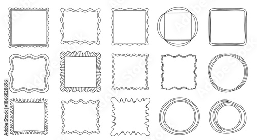 frame, border, collection, set, square, circle, round, shape, line art, outline, hand-drawn, vignetting, doodle, scribble, wavy, jagged, simple, minimal, design, vector, illustration, graphic, element, template, card, label, tags, photo, box, container, background, decoration, style, aesthetic, artistic, black, white, icon, variety, basic, classic, clean, modern, creative