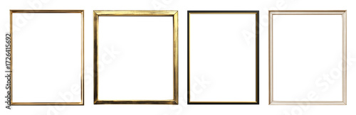 Collection of four empty rectangular picture frames with thin borders isolated on transparent background