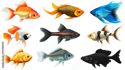 Collection of freshwater aquarium fish with water bubbles and aquatic plants.