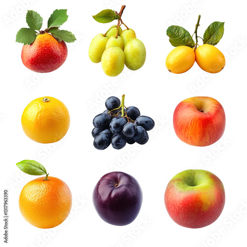 Collection of fruits including apples, oranges, and grapes on transparent background