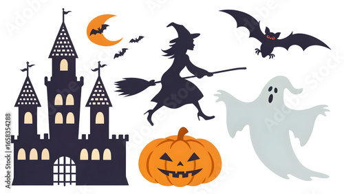 collection, halloween, abstract, vector, design, banner, isolated, art, illustration, party, cartoon, autumn, happy, black, sticker, moon, celebration, character, cute, graphic, candy, holiday, drawing, colourful, night, set, print, castle, decoration, hat, ghost, monster, sorcerer, zombie, element, symbol, creepy, horror, october, scarey, skittish, treat
