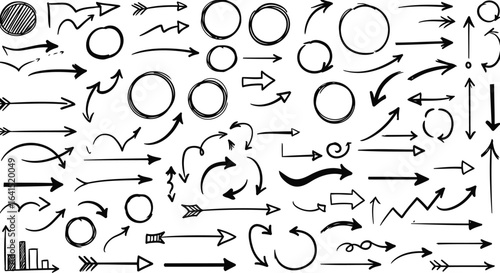 Collection of hand drawn black arrows and circles on white background sketch drawing