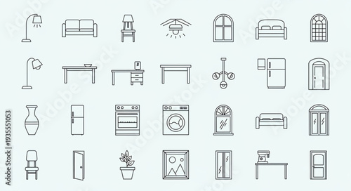 furniture, icon, vector, illustration, design, home, decor, interior, drawing, vignetting, hand, drawn, set, collection, object, graphic, art, minimalist, simple, line, sofa, chair, table, lamp, vase, door, window, cabinet, shelf, clock, plant, refrigerator, chandelier, desk, couch, stool, storage, room, architecture, element, symbol, outline, flat, style, modern, concept, white, background